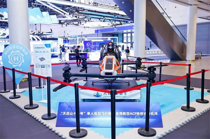 本届数贸会数智出行展区,天目山实验室发布的单人飞行器“天目山十一号”Vortex-F1颇为吸睛。
