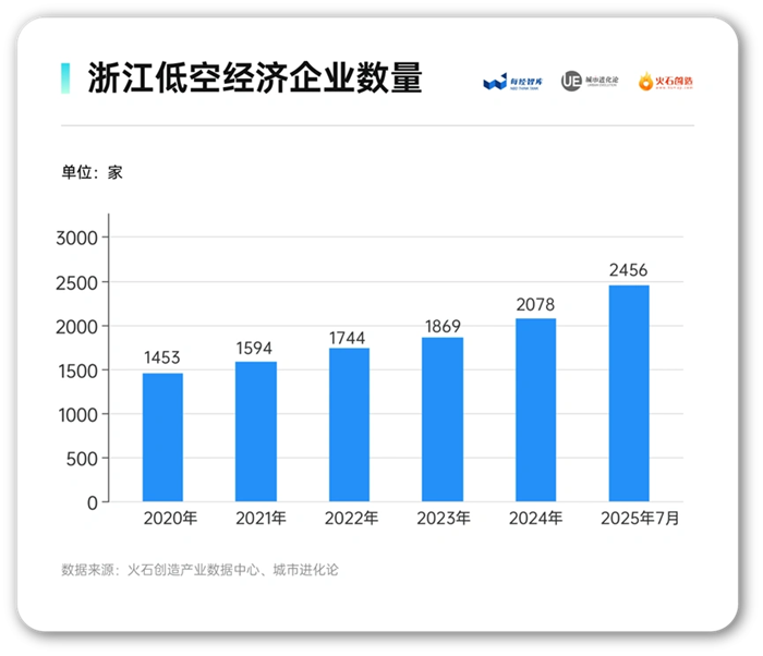 最新发布的《城市低空经济“链接力”指数(浙江2025)》显示,截至2025年7月,浙江低空经济相关企业达到2456家,较2020年增长近七成,保持强劲增长势头。同期低空经济上市企业从33家增长到43家,国家级专精特新“小巨人”企业从1家增至14家,引领型企业逐渐壮大。