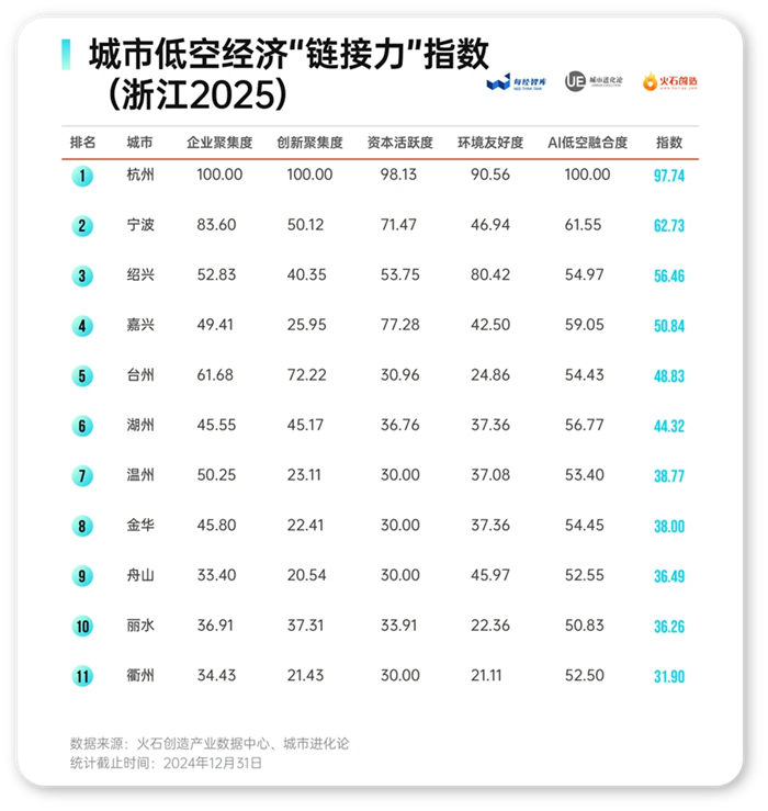 与杭州同为浙江“双子星”的宁波,低空经济“链接力”指数为62.73,位列浙江第二。从细分维度看,宁波企业聚集度、AI低空融合度均居全省第二,创新聚集度、资本活跃度、环境友好度均居全省第三,与杭州一道在浙江低空经济版图中呈现引领趋势。