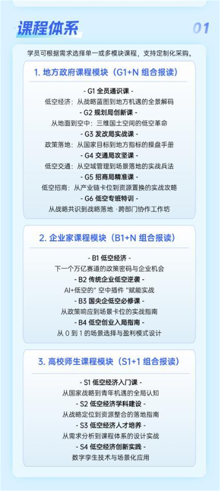 一是“地方政府班”,主要面向市/县级政府分管领导、发改/交通/规划/招商等部门负责人及业务骨干;二是“企业家班”,主要面向低空产业链企业、国央企创新部门、科创企业创始人及高管;三是“高校师生班”,主要面向高校管理者、院系学科带头人、青年教师及硕博研究生。